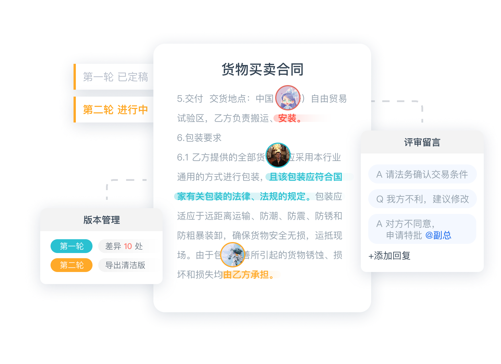 基于合同模板库、条款库、字段库,实现业务友好型在线合同规范起草。多人同屏协作,差异自动比对。历史版本、沟通内容均记录在案。