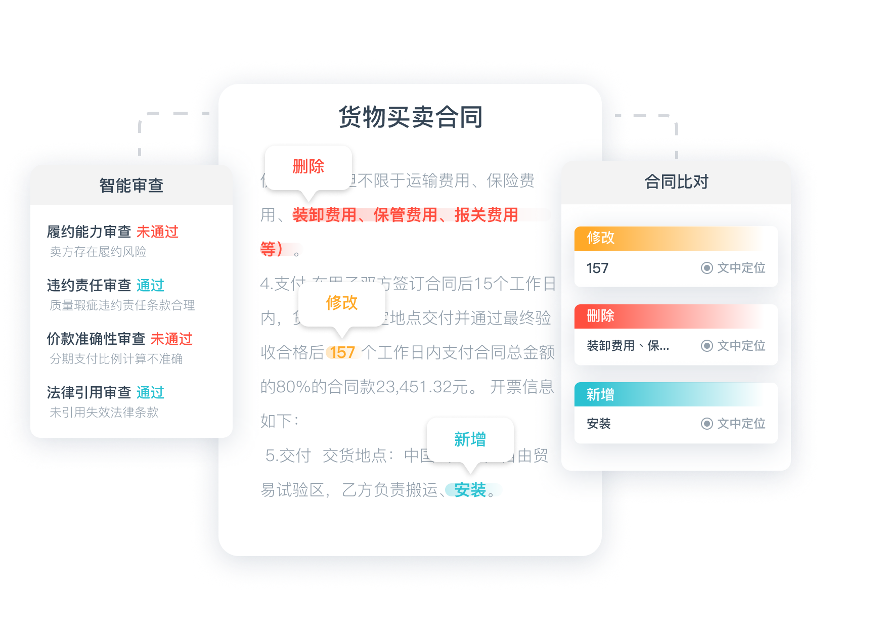 基于人工智能技术,自动识别并高亮合同风险,把控审核质量标准;一键识别条款修改,提升审查效率。