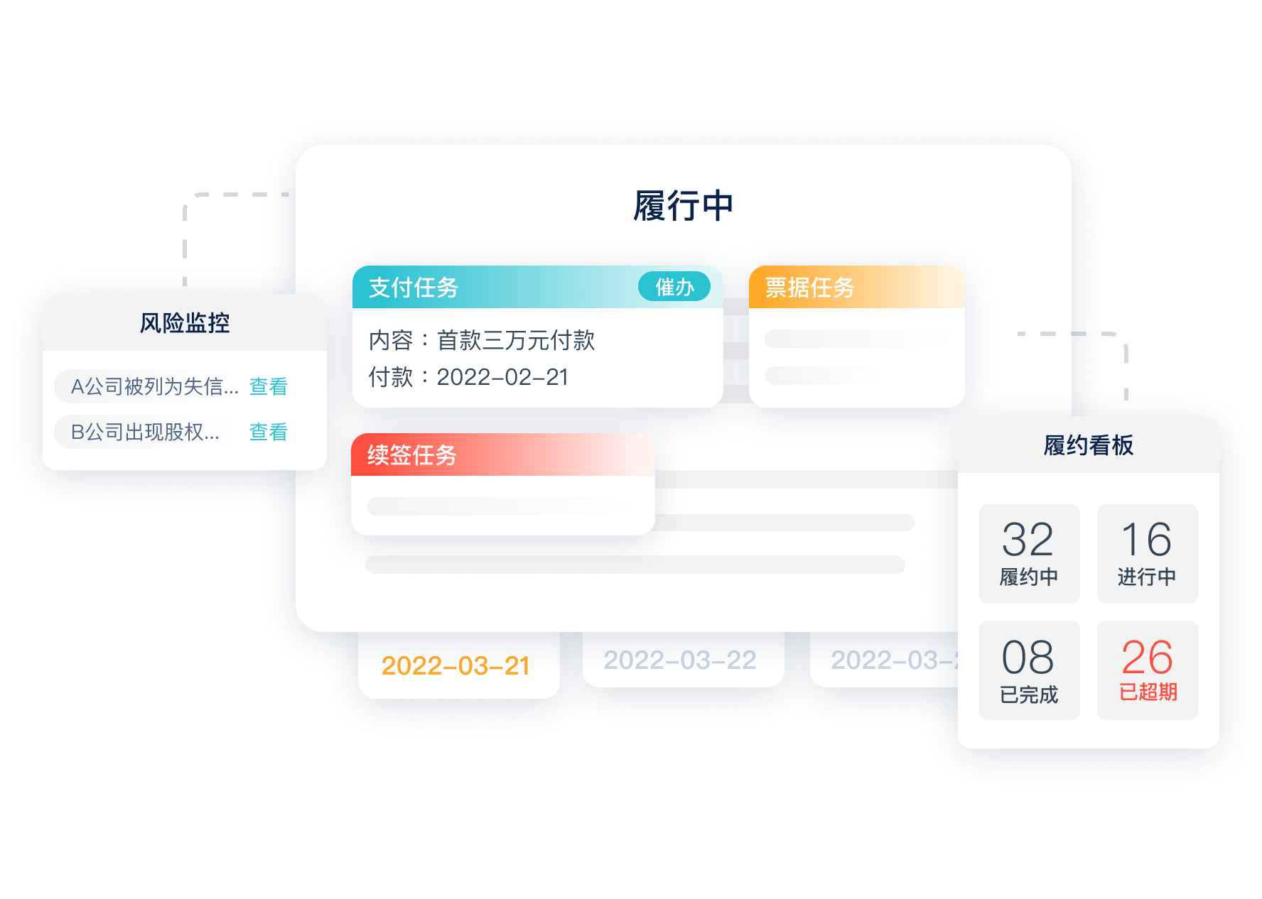 帮助管理者持续掌控全局合同履约进展,收付款发货任务快速创建,临期自动提醒。持续防范签约方主体履约风险。