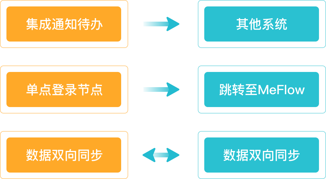 MeFlow可以无感地与您的其他系统一起使用。MeFlow可由其他系统单点登录进入,可以将待办通知发送到其他系统内,支持系统间数据的双向同步等等,满足您的集成需要。